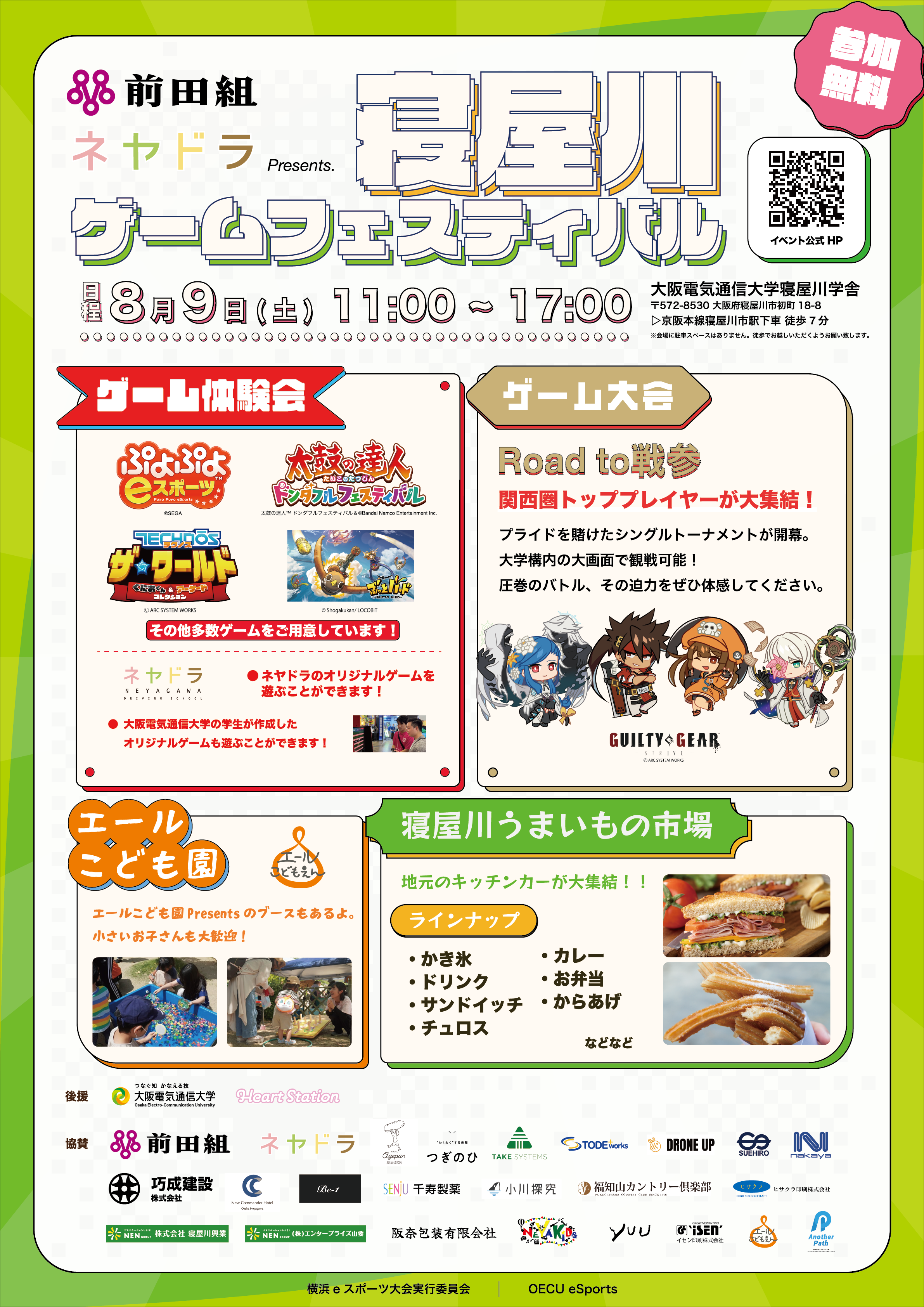 2025年8月9日(土)大阪電気通信大学様の寝屋川学舎にて、 「寝屋川ゲームフェスティバル」が開催されます。