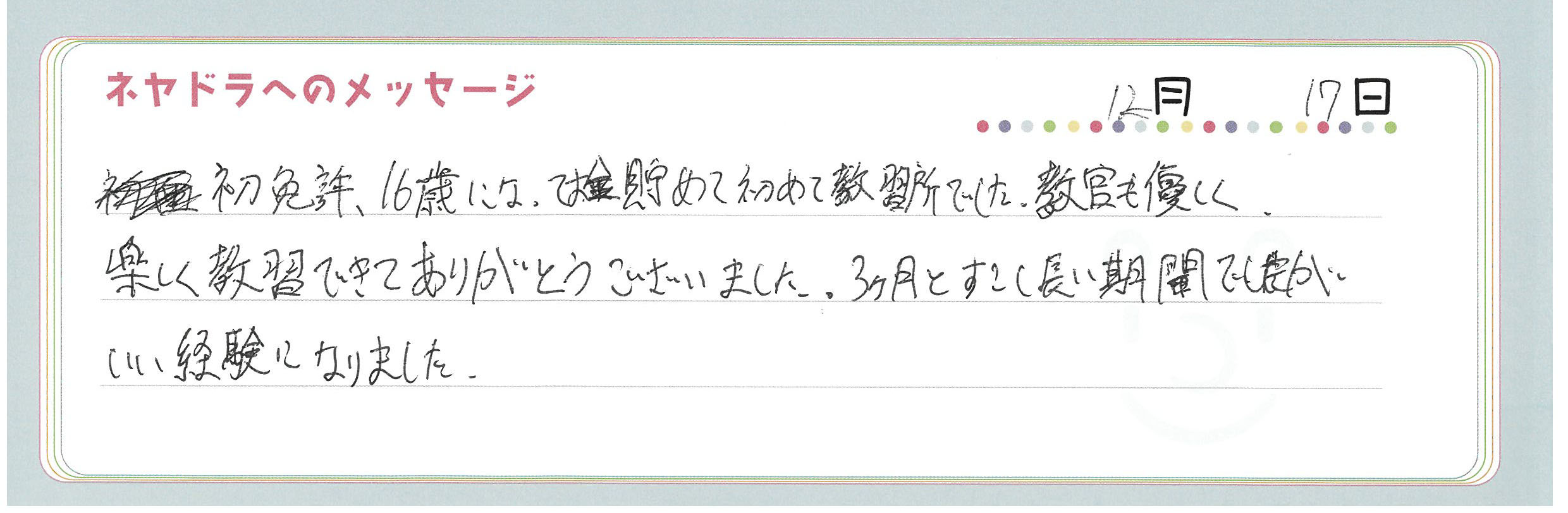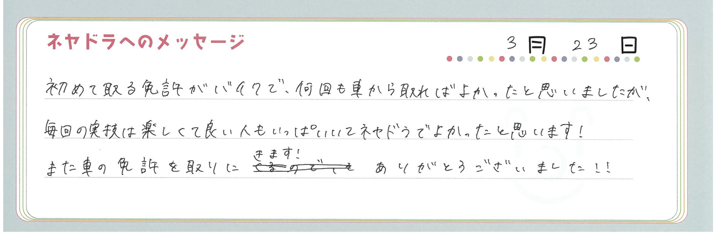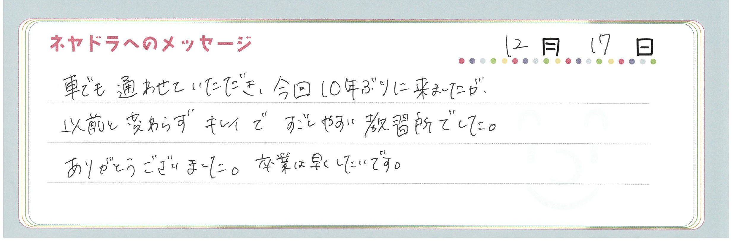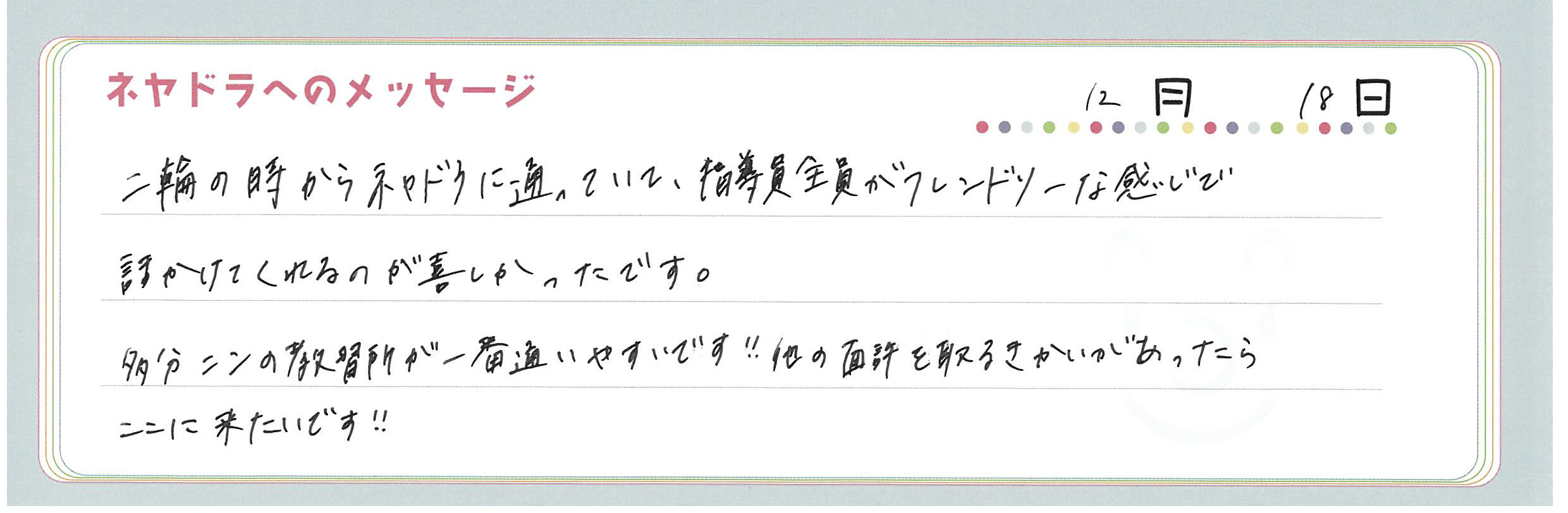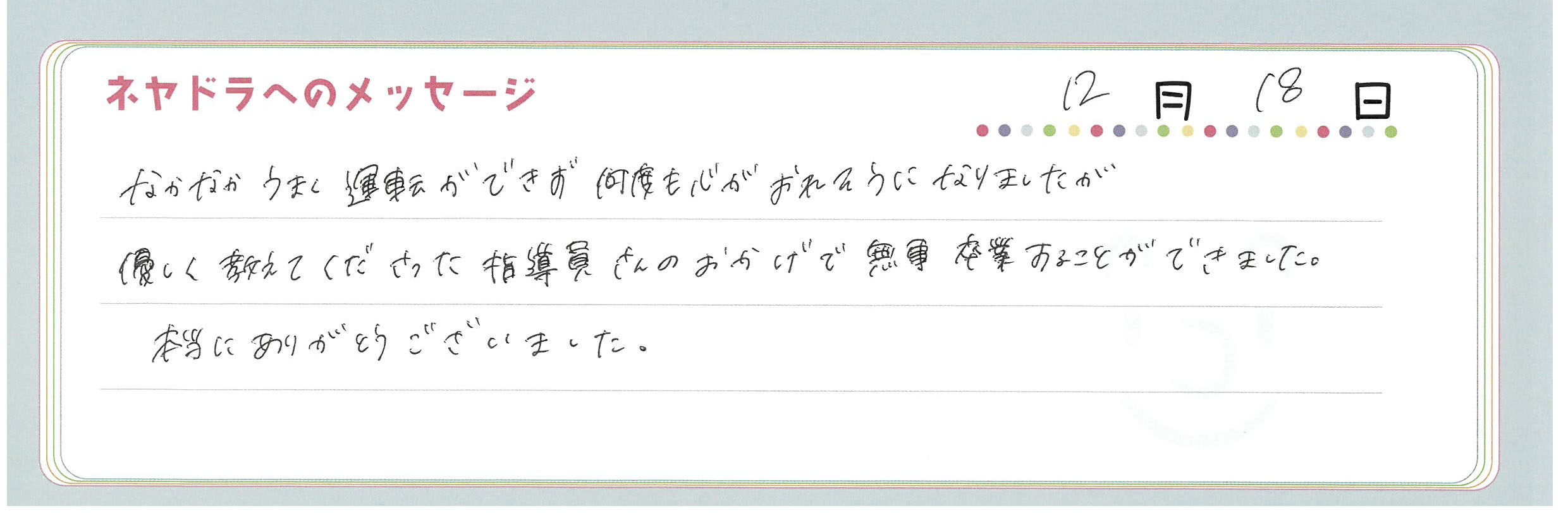 ネヤドラを卒業し、本日無事免許を所得しました。本当にありがとうございました!