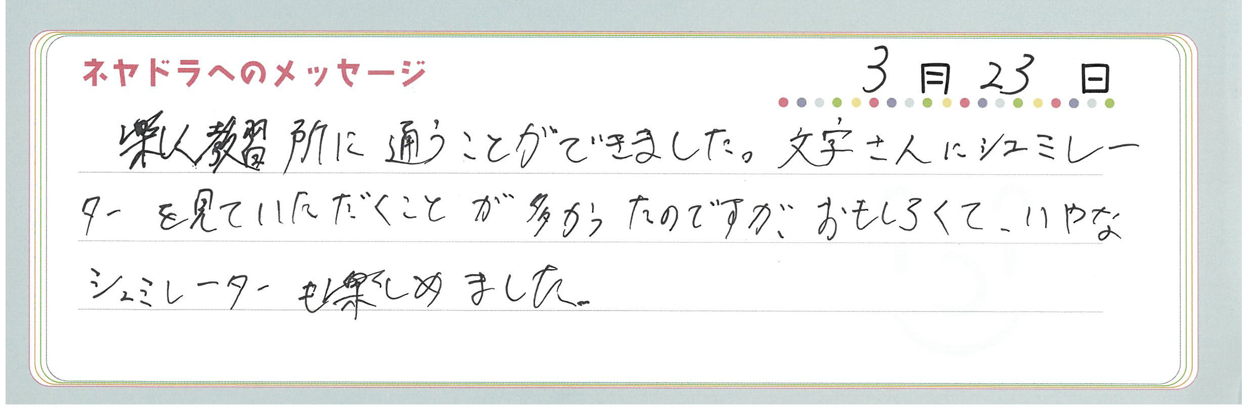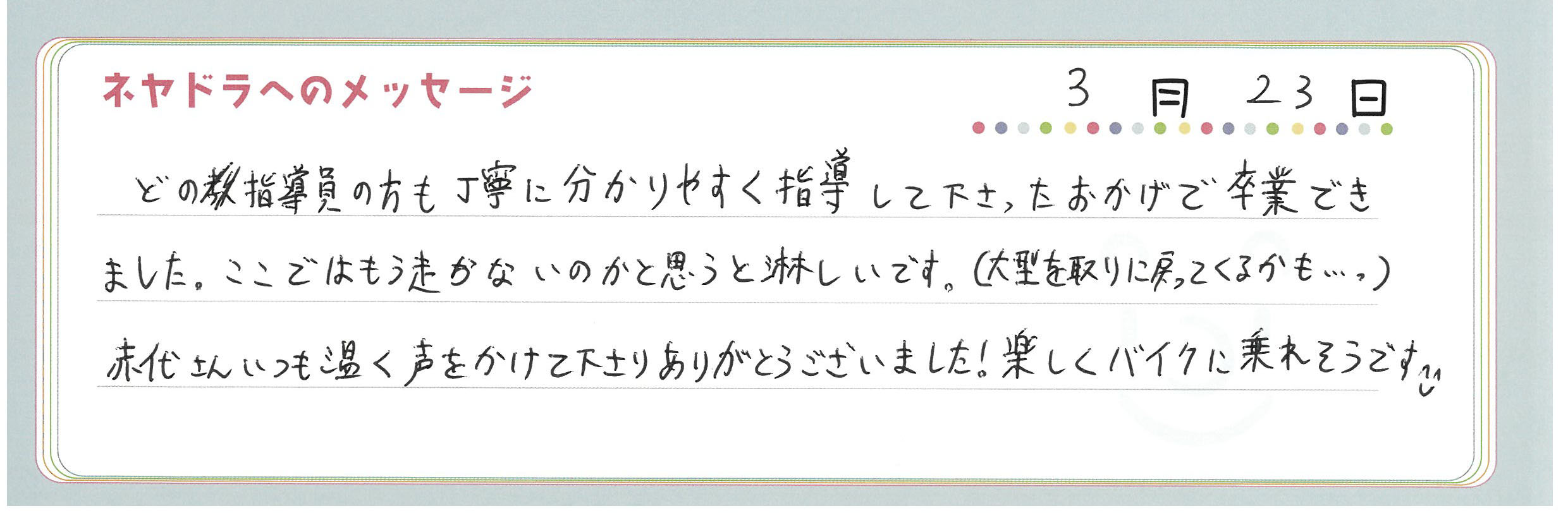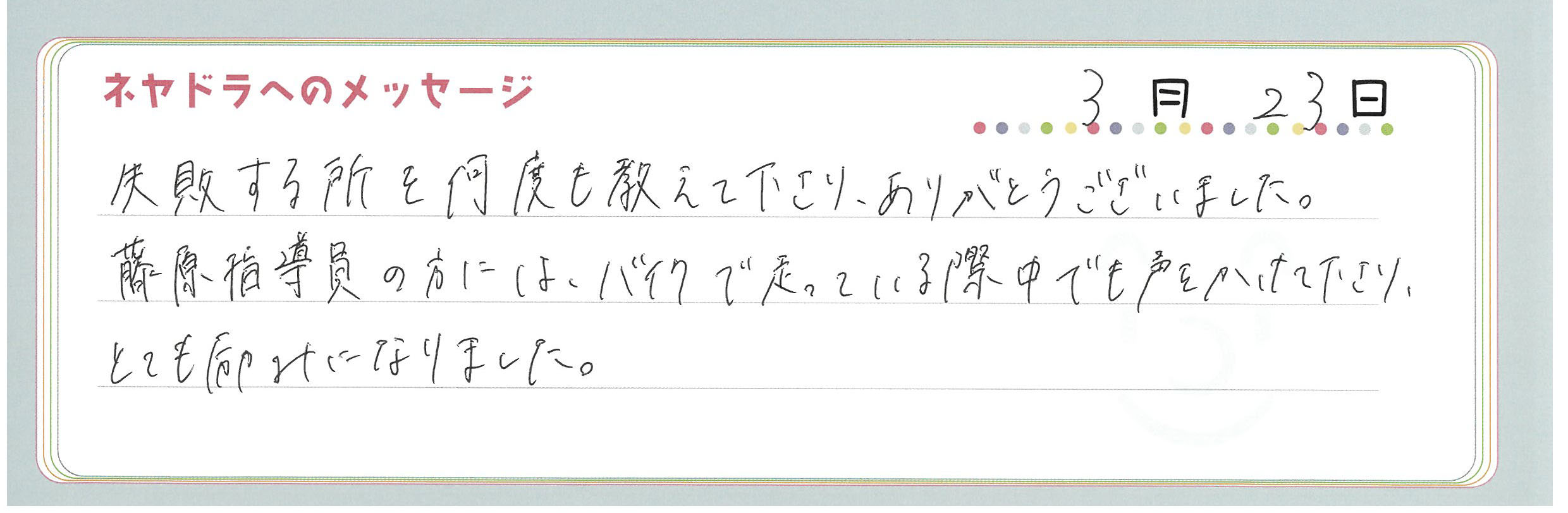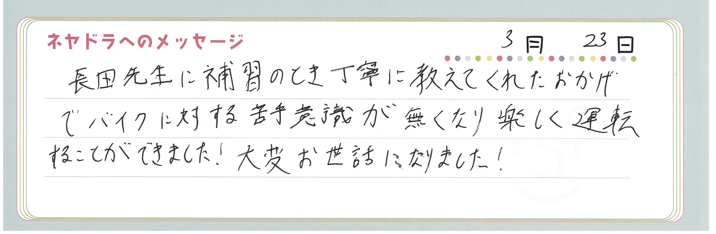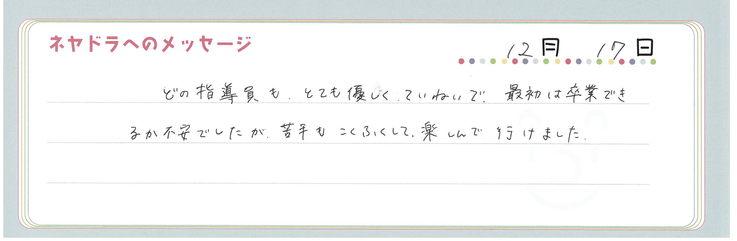 ネヤドラを卒業し、本日無事免許を所得しました。本当にありがとうございました!