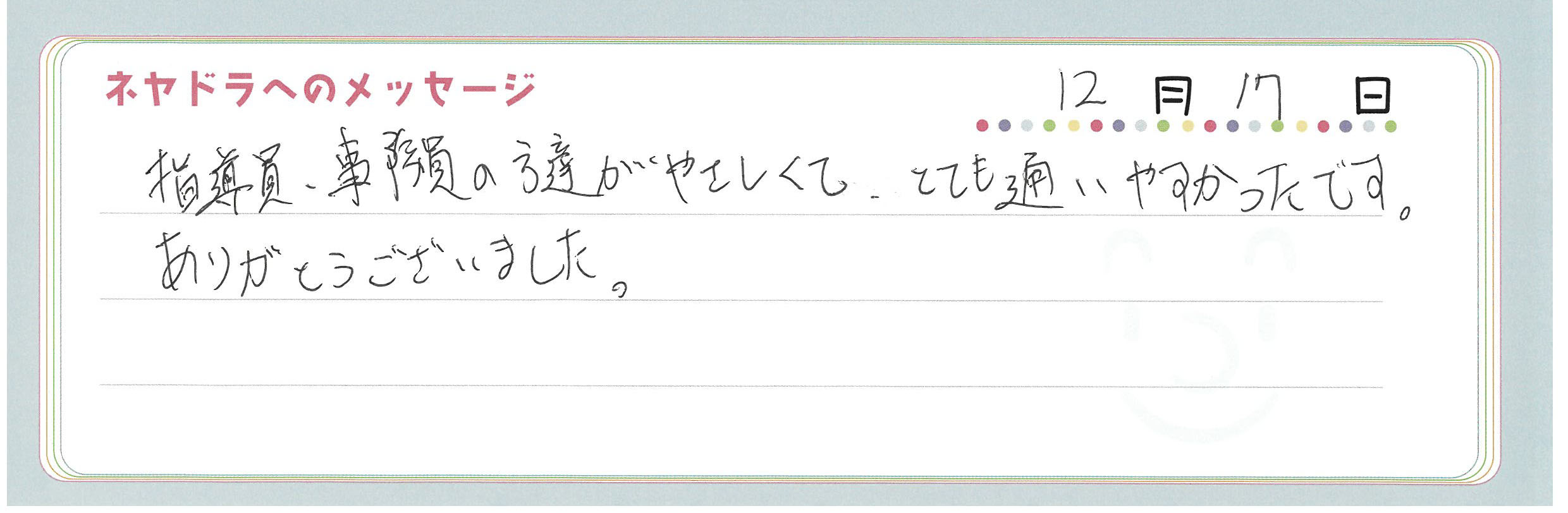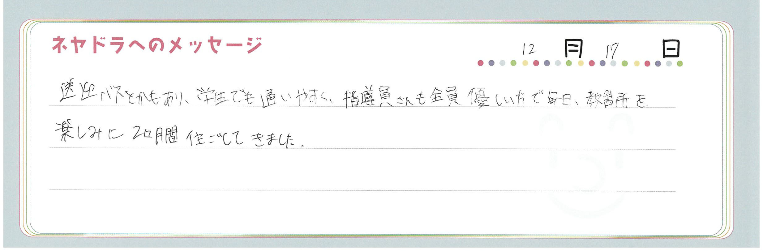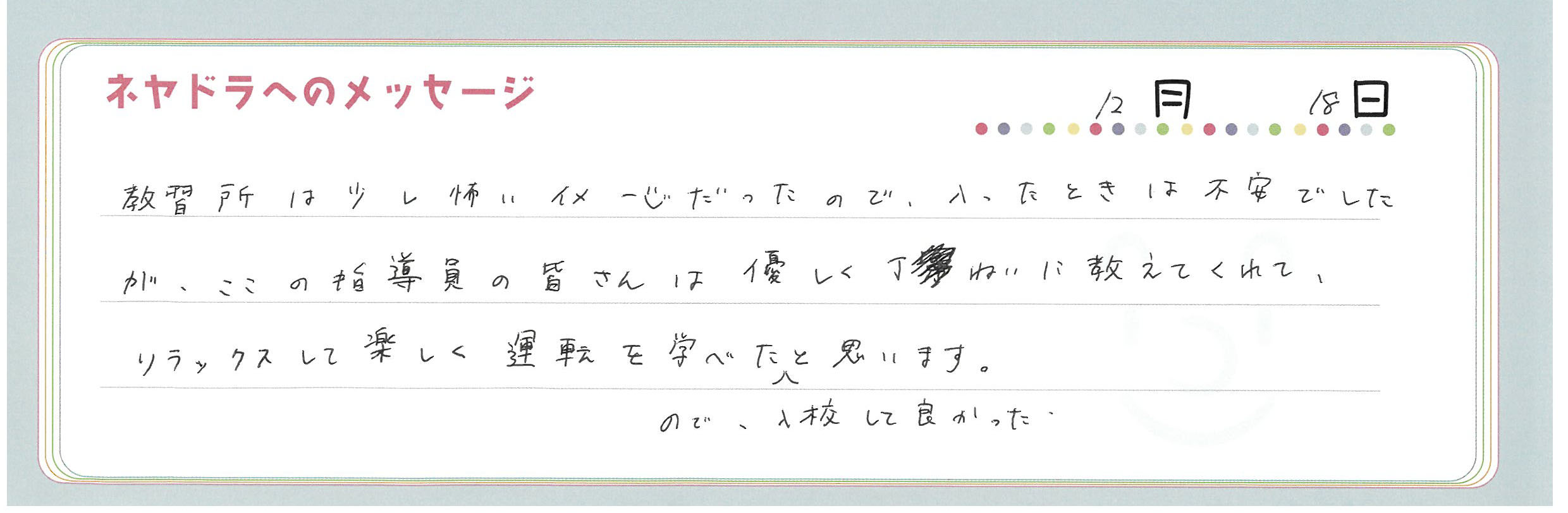 指導員さん、フロントスタッフさん、バスの運転手さん全ての人が丁寧で優しすぎます。学科教習も技能教習もほんとに楽しくて、ネヤドラを選んで良かったなと心から思っています。ネヤドラで教わったことを生かして、安全運転することが恩返しだと思うのでこれから頑張ります! -