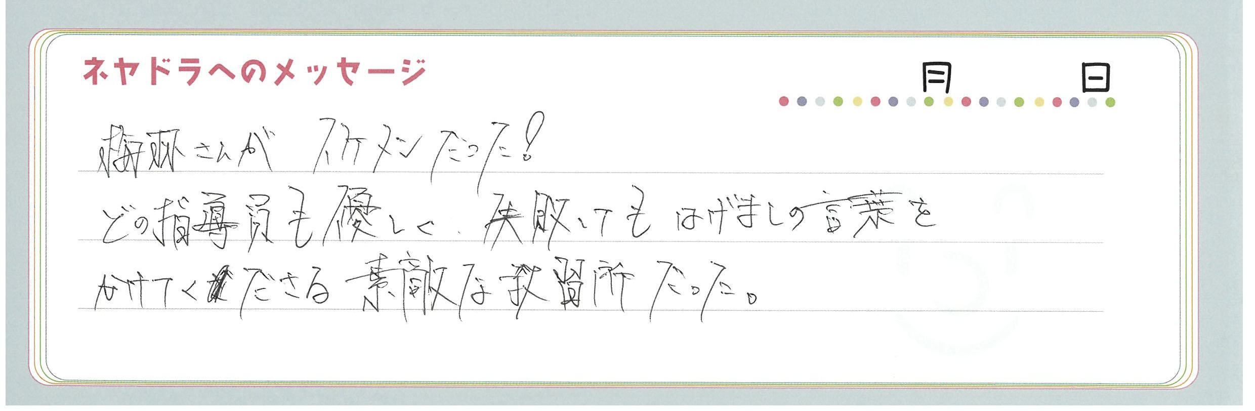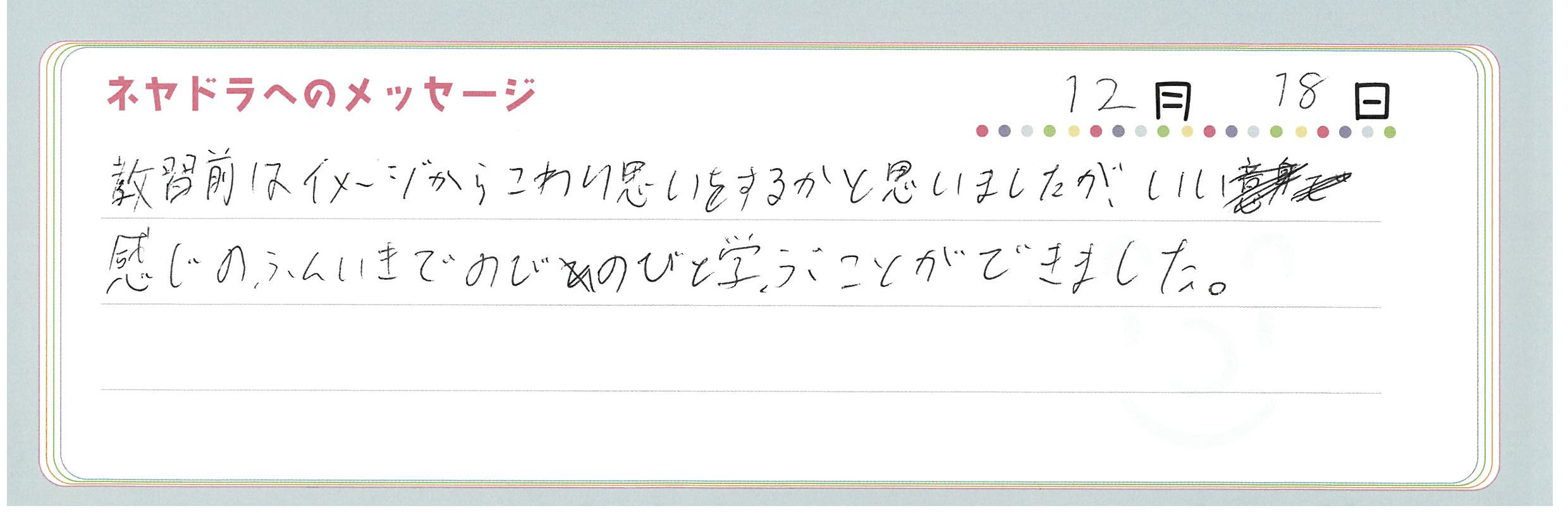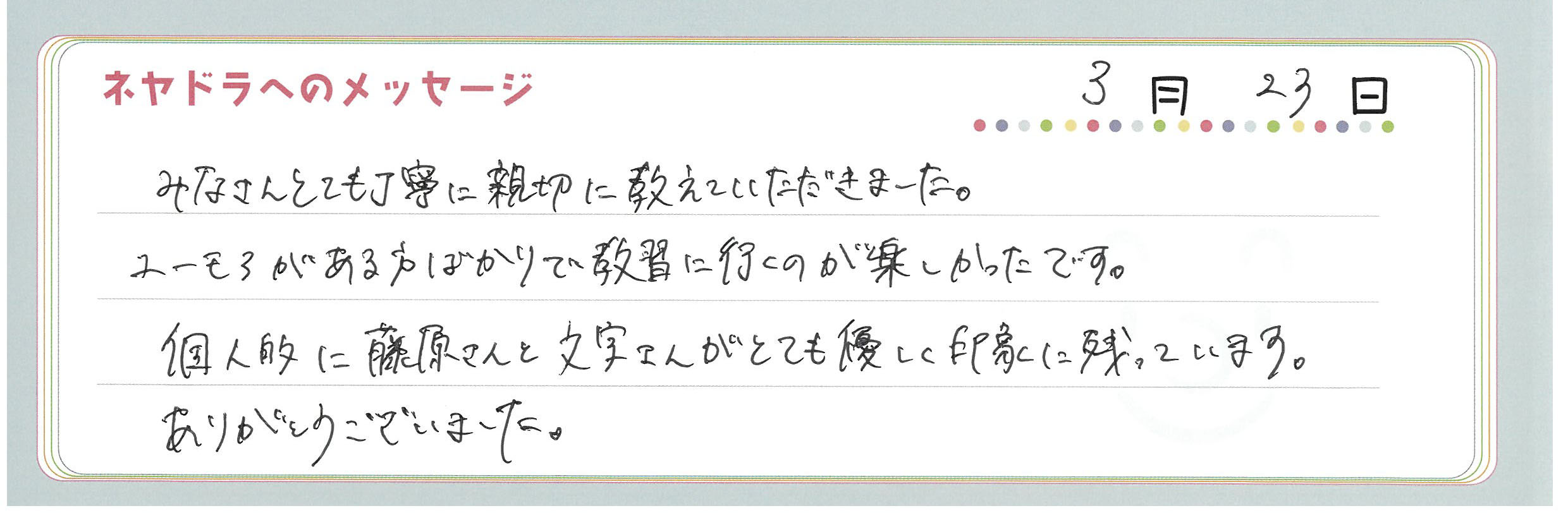 受付の皆様も指導員の皆様も本当に優しくて、丁寧且つわかりやすい説明で、ネヤドラに通うのが本当に楽しかったです!!楽しすぎてもう少し通いたかった笑ネヤドラを選んで本当に良かったと心から思います!!本当に本当にありがとうございました!! -