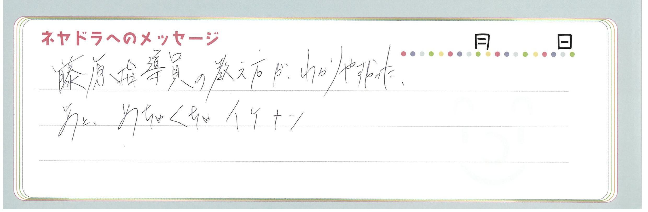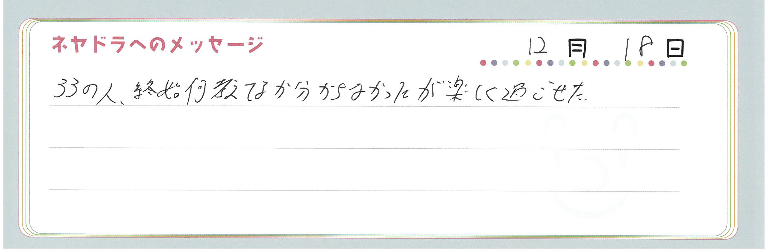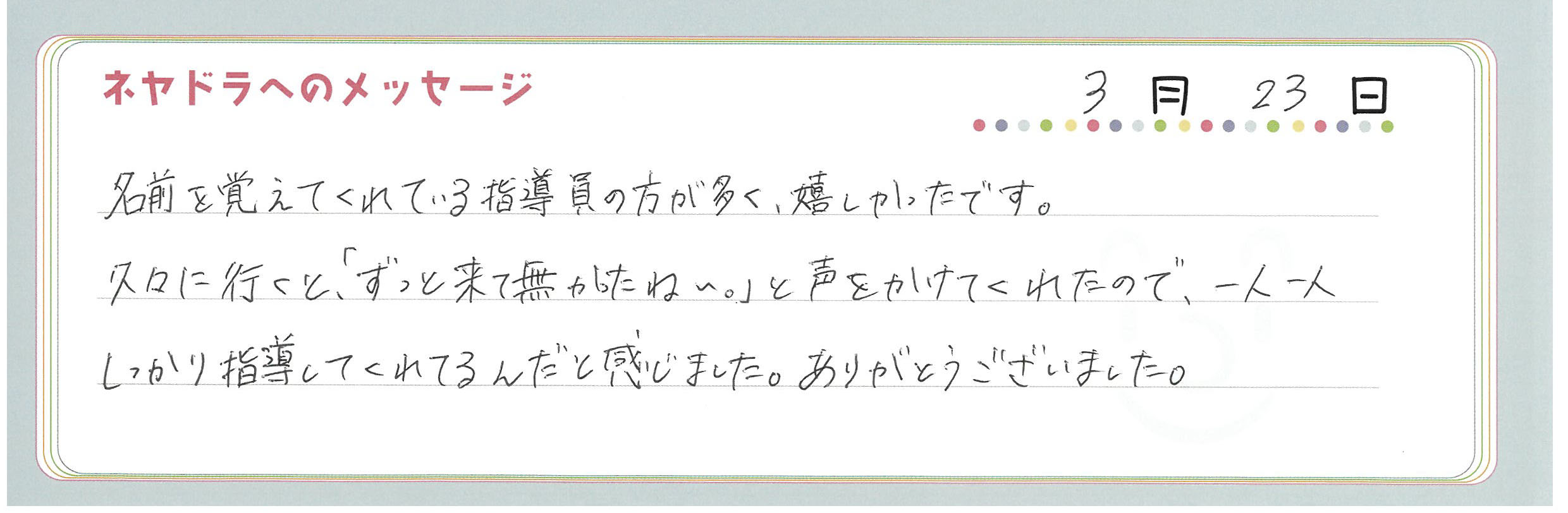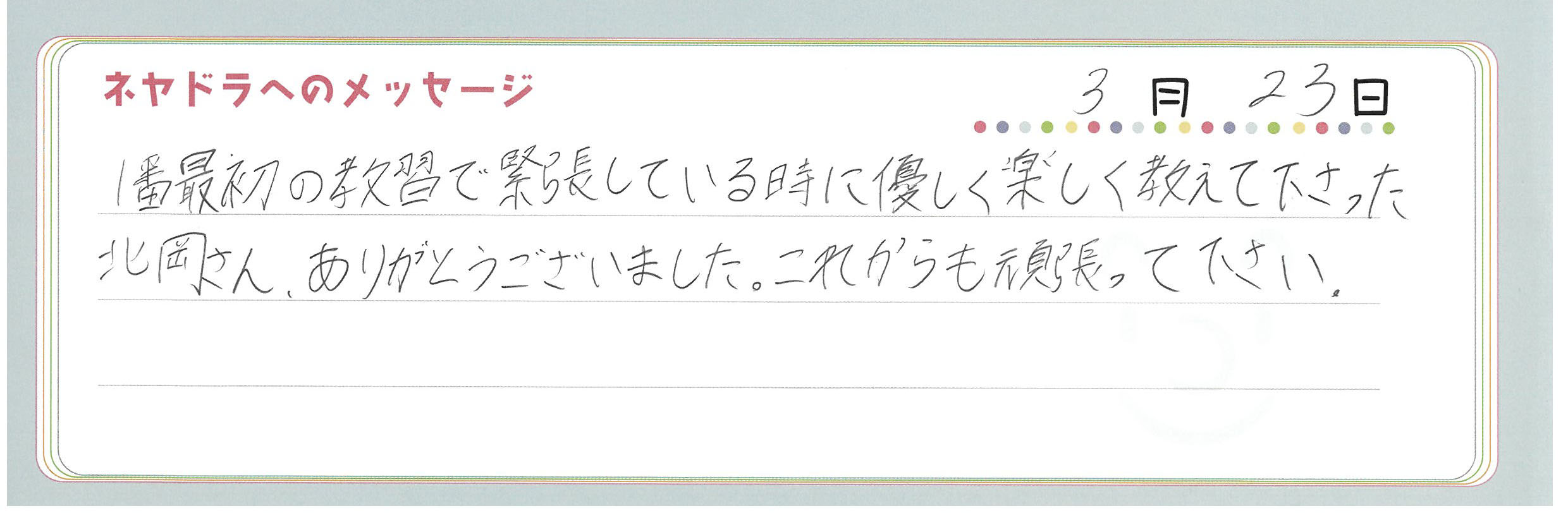 受付の皆様も指導員の皆様も本当に優しくて、丁寧且つわかりやすい説明で、ネヤドラに通うのが本当に楽しかったです!!楽しすぎてもう少し通いたかった笑ネヤドラを選んで本当に良かったと心から思います!!本当に本当にありがとうございました!! -